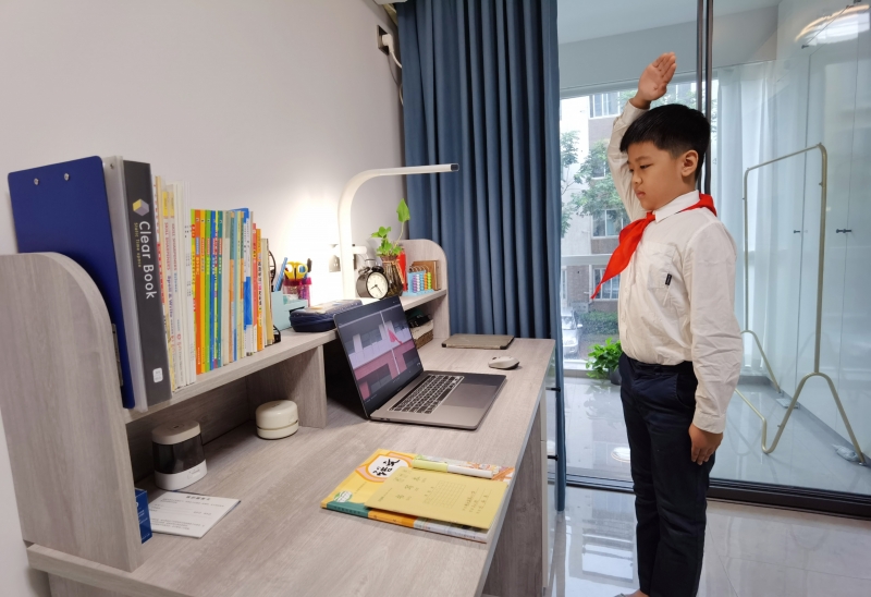 9月1日上午8点,郑州市金水区纬五路第二小学师生齐聚云端,进行2021—2022学年上学期线上开学典礼。伴随着云升旗视频,学生们向国旗庄严敬礼,纬五路二小党总支书记、校长焦憬为学生们上开学第一课《有一种力量,从未改变》 (通讯员 张亚龙 摄 )