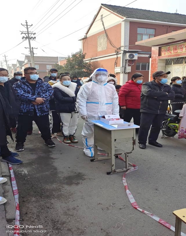 “疫情不退,我们不退,有疫情的地方就是我们的战场。”在安阳市林州市桂园社区小菜园村,2021级电气2班学生路滨珲协助村干部做好分发试剂、扫码检测等志愿服务工作。
