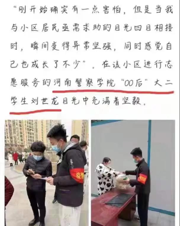 寒假刚刚开启,河南多个地方陆续爆发新冠疫情。人民至上,在河南迅速掀起抗击新冠肺炎的人民战争。作为警察管理系的一名学警,理应冲在抗击疫情第一线,我义无反顾地加入社区志愿者服务行列。从事志愿服务以来,我每天按时电话询问外省返乡居民、居家隔离人员健康状有无异常,每天对500余人进行体温监测。事情虽然很小,也很繁琐,但却有意义。正值第二个中国人民警察节,作为一名学警,我要以光荣的人民警察身份要求自己,时刻把人民放在心中,对党忠诚,服务人民,执法公正,纪律严明,矢志不渝做中国特色社会主义事业的建设者、捍卫者!