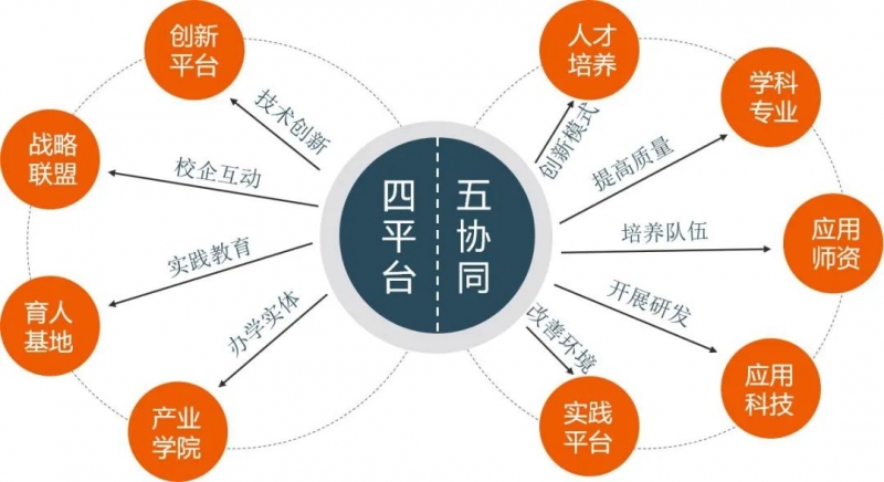 “五协同”促进应用型人才培养实施方案。一是聚焦企业人才需求,协同创新人才培养模式。通过行业调研及企业的实质性参与,形成更满足行业企业需求的人才培养目标,更符合职业人才能力标准、突出能力培养的课程体系,构建适合应用型人才培养目标的管理保障体系。二是聚焦企业产业发展,协同提高学科专业质量。通过建立理事会和专业建设委员会,紧密结合行业企业发展需求,科学选定学科专业发展方向;通过整合资源,建设实践育人平台,开展教学研究与改革,打造专业人才培养特色。三是聚焦企业骨干培养,协同培养应用型师资队伍。建立更加灵活的人才引进、任职和培育机制,通过项目开发、实践研修、岗位互换、顶岗实践等路径,分层次、分批次构建稳定的应用型师资团队。四是聚焦企业技术研发,协同开展应用型科技研发。针对行业关键、核心技术,与企业共同组建科技团队,依托协同创新平台,在检测认证、委托和联合研发、技术成果转化方面,实现多形式合作,提升社会服务能力。五是聚焦企业设备利用,协同改善实践教学平台与环境。结合专业培养标准和实践教学特点,校企共建系统化的实践教育资源环境,助推实践教学课程体系的完善与实施,共建仿真实验实训场所和一体化的实践教学基地。