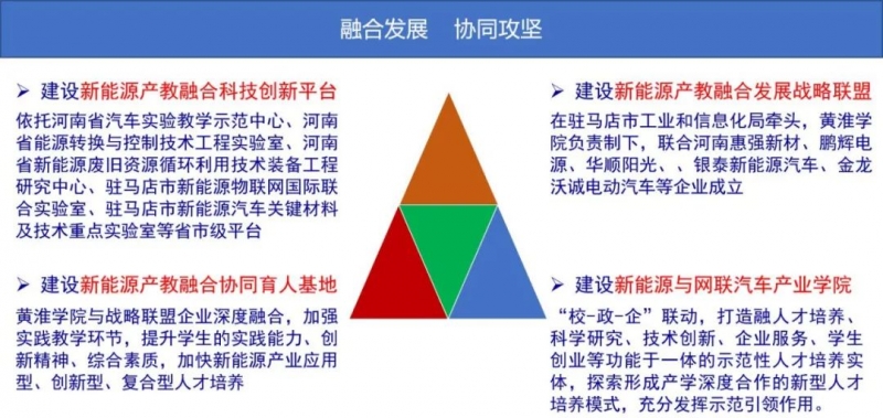 “四平台”深化产教融合实施方案。一是依托河南省工程研究中心、工程实验室等省市级平台建设新能源产业产教融合创新平台;二是在驻马店市工信局牵头,黄淮学院负责联合惠强新材、鹏辉电源等企业联合建设新能源产业产教融合战略联盟;三是与联盟企业深度融合,建设新能源产业产教融合协调育人基地;四是“校-政-企”联动,融合发展,协同攻坚,建设新能源与网联汽车产业学院,“四平台”推进产教深度融合,充分发挥示范引领作用。