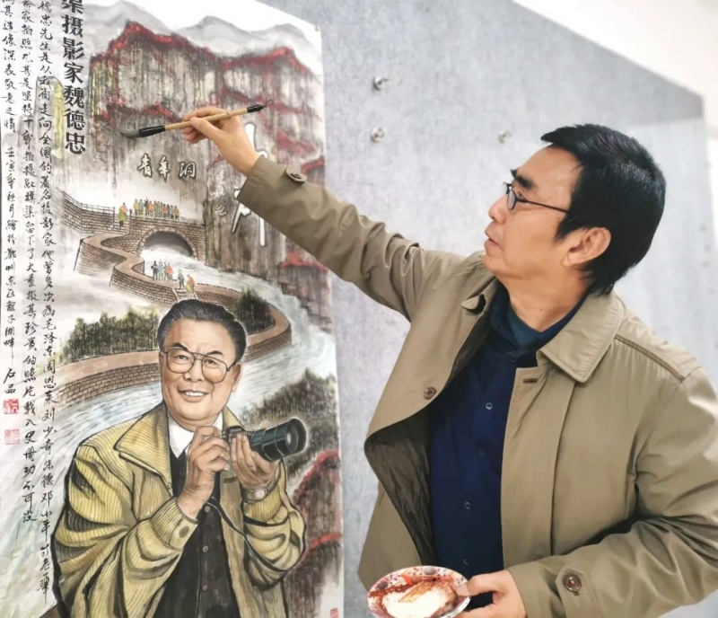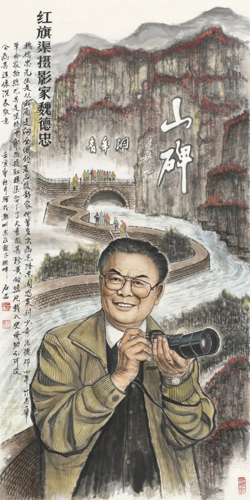 石品希望以艺术的形式讲述红旗渠故事,弘扬红旗渠精神。他说:“魏德忠先生虽未直接参与红旗渠建设,但10年坚持拍摄红旗渠建设,对弘扬红旗渠精神来说功不可没,同样是一位英模人物。因此,我满怀对魏德忠先生的敬仰,创作了《红旗渠摄影家魏德忠》这幅作品。画面中,背景是巍巍太行和青年洞等代表性元素,画面核心则描绘了魏德忠先生充满激情地拍摄红旗渠建设的场景。作为一名美术教育工作者,希望能通过这幅作品,为弘扬红旗渠精神尽一份力。”