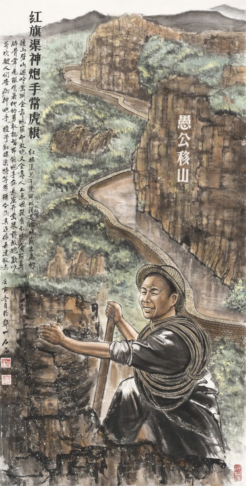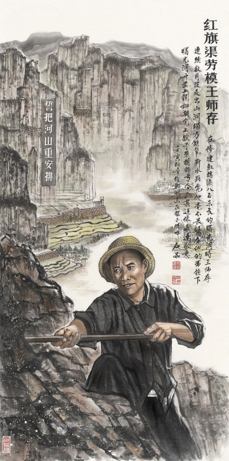 作品鉴赏:“人工天河”红旗渠在建造过程中涌现出了许多英雄人物,“凿洞能手”王师存便是其中之一。在那个艰苦创业的年代,王师存带领村民踏险峰,攻难关,历经艰难险阻,成功打通曙光洞,被评为“红旗渠建设特等模范”。石品的这幅《红旗渠劳模王师存》便源于此。