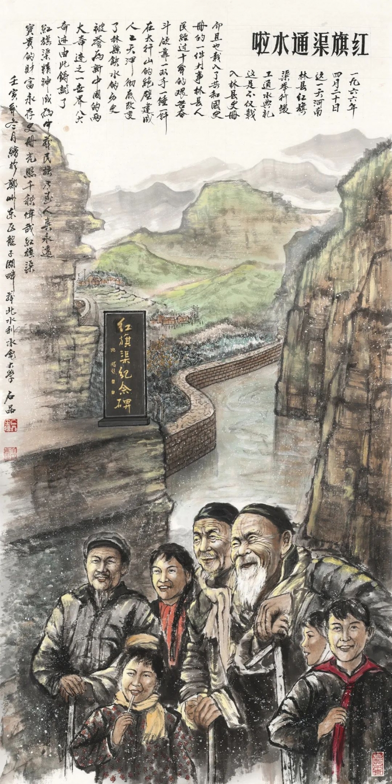 据此,石品创作了《红旗渠通水啦》这件作品。林县人民十年艰苦奋斗,硬靠一双手、一锤、一钎,在太行绝壁开凿“人工天河”。渠水流淌,怎能不令林县人民激动、喜悦!画面中,男女老少望着哗哗渠水,无不满脸喜悦,林县缺水的面貌改变了,有水的梦想实现了。水墨人物画特有的表现形式使得画面人物形神兼备,尤其是画面上的胡子老人,面部皱纹反映着生活的沧桑,但脸上的喜悦笑颜真实发自心底,令人过目不忘,实为“经典”形象。画面氛围的营造也颇具匠心,近景的渠水、立于岩石上由著名书法家沈鹏题写的“红旗渠纪念碑”,远处的屋舍、梯田、群山,为人留下了无限的遐想空间,意境深远,使得作品主题得到了有力升华