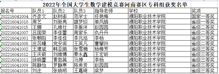 近日,2022年“高教社杯”全国大学生数学建模竞赛成绩揭晓,濮阳职业技术学院数学与信息工程学院代表队获得专科组全国总决赛一等奖!指导老师任艳梅老师被任命为河南省大学生数学建模评审组专家!这是学校参加该项赛事以来第二次获得全国一等奖的好成绩。同时单凤娟老师指导的团队获得河南省一等奖。李杨、曹攀玲、赵园园老师指导队伍获得省级二等奖,另有五支队伍获得省级三等奖。