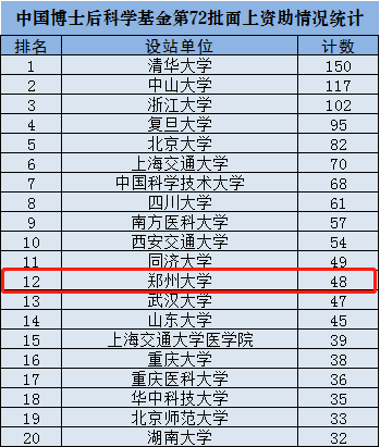 近日,中国博士后科学基金第72批面上资助拟资助人员名单公布,共有3651名拟资助人员入选。郑州大学有48人入选,比去年同期增加了9人,排名位居全国第12位,比去年同期提高了6名。