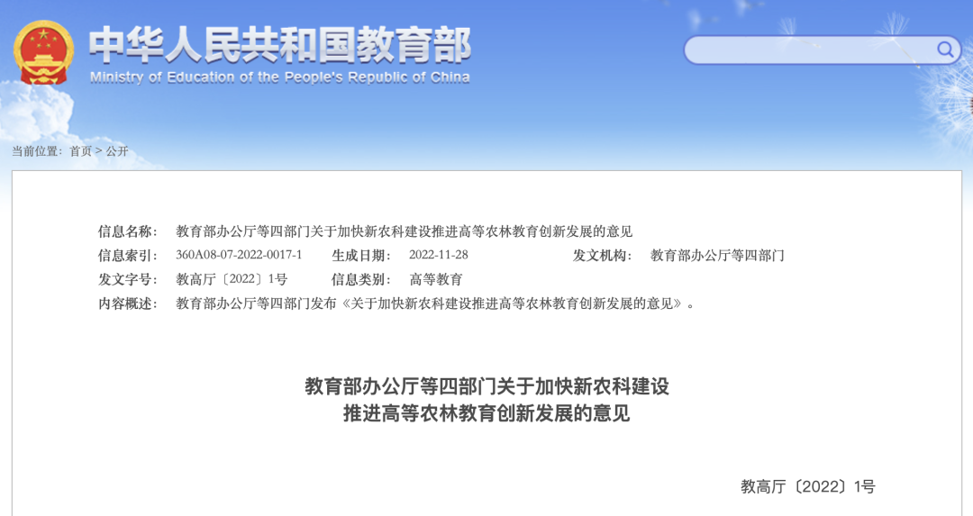 12月7日,教育部网站发布教育部办公厅等四部门发布《关于加快新农科建设推进高等农林教育创新发展的意见》。文件内容指出: