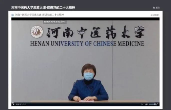 为深入学习宣传贯彻党的二十大精神,不断提升学生思想理论水平、坚定理想信念,12月21日,河南中医药大学党委书记李小芳以《青春心向党 奋进正当时》为题,为全校学生线上讲授党的二十大精神专题思政课。