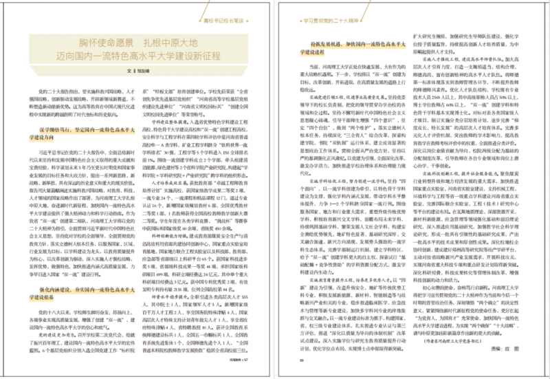 习近平总书记在党的二十大报告中,全面总结新时代以来坚持和发展中国特色社会主义取得的重大成就和宝贵经验,科学谋划未来5年乃至更长时期党和国家事业发展的目标任务和大政方针,提出一系列新思路、新战略、新举措,具有深远的历史意义和重大的现实价值。报告用大量篇幅阐述实施科教兴国战略,对教育、科技、人才领域的国家战略作出了部署,为河南理工大学扎根中原大地,奋进新时代新征程,加快国内一流特色高水平大学建设提供了强大精神动力和科学行动指南。作为我省“双一流”创建第二梯队,河南理工大学将以党的二十大精神为指引,全面贯彻习近平新时代中国特色社会主义思想,坚持党对学校的全面领导,全面贯彻党的教育方针,落实立德树人根本任务,以服务国家、区域、行业发展为目标,以学科建设为龙头,以教育质量提升为核心,以改革创新为驱动,深入实施人才强校战略,发挥优势,做强特色,加快推进内涵式高质量发展,力争早日进入国家“双一流”建设行列。