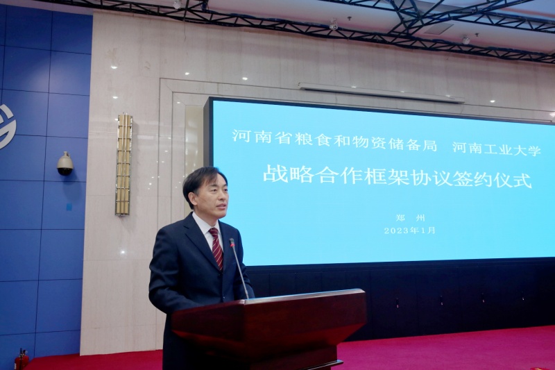 李成伟对河南省粮食和物资储备局长期以来关心和支持学校发展建设表示感谢。他表示,此次战略合作的签署是坚决贯彻落实习近平总书记在党的二十大报告中提出“全方位夯实粮食安全根基”的重要举措,是局校双方共同“扛稳粮食安全重任,加快推进粮食产业高质量发展”的使命担当,更是坚决扛稳管好“大国储备”和“天下粮仓”政治责任的具体体现。他指出,河南省粮食和物资储备局作为河南省委贯彻落实党中央关于粮食和物资储备工作方针政策和决策部署的重要政府机构,在构建新时代粮食安全保障体系,保障国家粮食安全方面发挥了重要作用,做出了突出贡献。作为河南省人民政府与国家粮食和物资储备局共建高校和河南省“双一流”创建高校,学校拥有全国最完整的粮油食品学科群,具有雄厚的师资力量和较强的科研实力。学校一定会抓住与省局战略合作的重要机遇,充分发挥学校在人才、科技和创新等方面优势,支持和推进双方合作内容落地见效,开花结果,为河南省粮食和物资储备事业高质量发展提供科技支撑,为扛稳国家粮食安全重任作出更大的贡献。