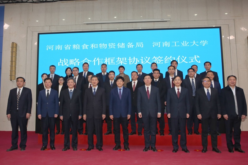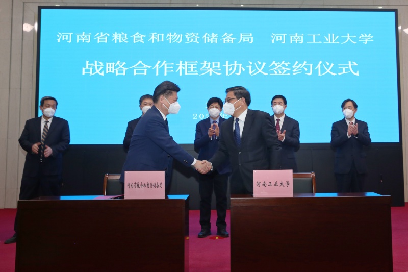 河南工业大学副校长陈复生与河南省粮食和物资储备局副局长赵连辉代表校局双方签订了战略合作框架协议