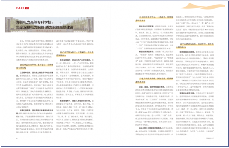 近年,郑州电力高等专科学校深入贯彻落实习近平总书记关于职业教育的重要论述和指示批示精神,全面落实《国家职业教育改革实施方案》,扎根中原大地、把握类型定位、深耕电力职教、服务区域经济,努力把学校建设成为具有卓越竞争力和国际影响力的高水平电力高等职业院校,为服务现代化河南建设贡献电力职教力量。