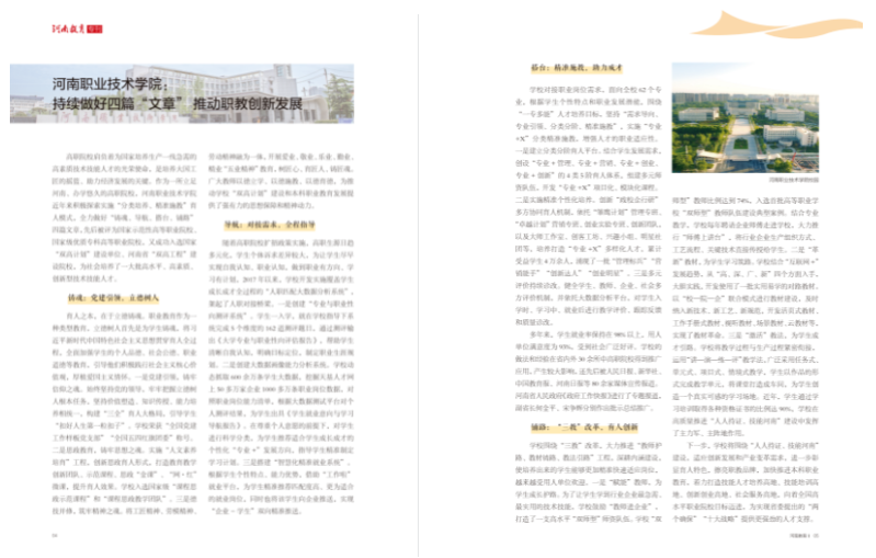 高职院校肩负着为国家培养生产一线急需的高素质技术技能人才的光荣使命,是培养大国工匠的摇篮、助力经济发展的关键。作为一所立足河南、办学悠久的高职院校,河南职业技术学院近年来积极探索实施“分类培养、精准施教”育人模式,全力做好“铸魂、导航、搭台、铺路”四篇文章,先后被评为国家示范性高等职业院校、国家级优质专科高等职业院校,又成功入选国家“双高计划”建设单位、河南省“双高工程“建设院校,为社会培养了一大批高水平、高素质、创新型技术技能人才。