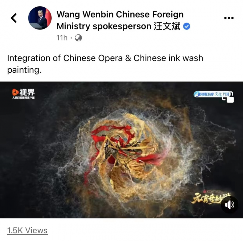 2月7日外交部发言人汪文斌在Meta平台上发布河南卫视《国风浩荡2023元宵奇妙游》节目《大戏登场》,向全世界推介,并配文:“中国戏曲、中国水墨画的融合。”