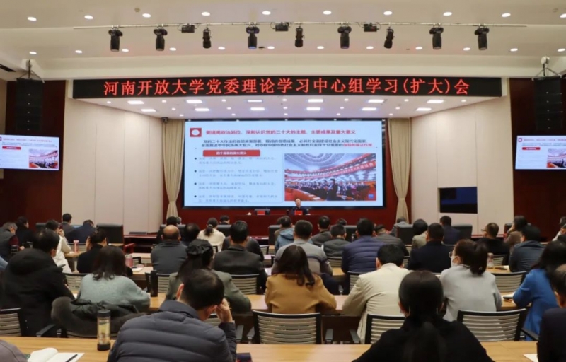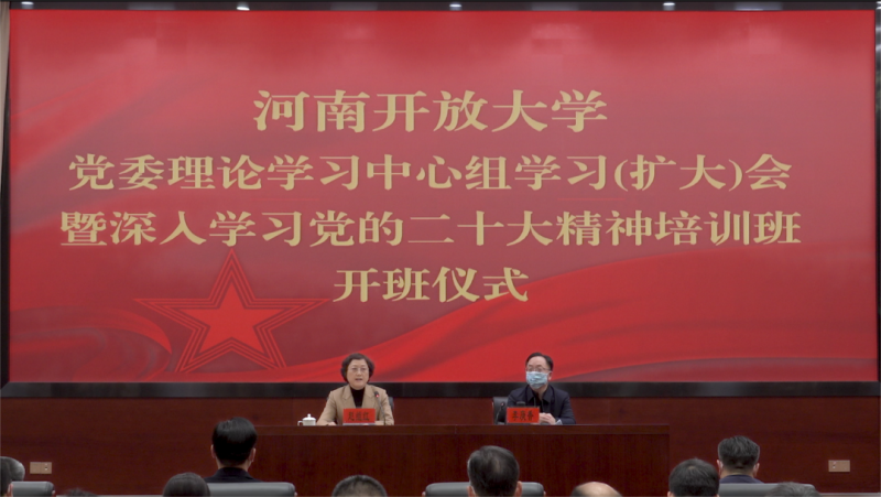 2月23日下午,河南开放大学在办公楼二楼会议室召开党委理论学习中心组集体学习(扩大)会暨中层干部深入学习贯彻党的二十大精神专题培训班开班式,学习河南省社科联党组书记、主席李庚香题为《全面学习全面掌握全面落实党的二十大精神 为全面建设社会主义现代化国家全面推进中华民族伟大复兴而团结奋斗》的专题辅导。全体在校校领导、副处级以上干部参加会议。会议由河南开放大学党委书记赵继红主持。