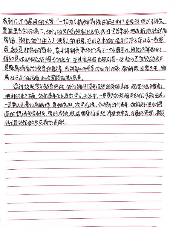 最后,学生代表在抗战广场分享了学习感悟。大家纷纷表示,在那段艰苦的岁月里,革命先辈为了革命事业抛头颅、洒热血,舍生忘死、艰苦奋斗。今天的幸福生活来之不易,一定要倍加珍惜,作为青年学生,应听党话、跟党走,知党情、感党恩,立志做有理想、敢担当、能吃苦、肯奋斗的新时代好青年,让青春在新征程中绽放绚丽之花。