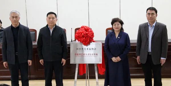 活动现场,马国强、石品、魏小杰、常江为“河南省美术家协会技能型艺术人才培养基地”揭牌。