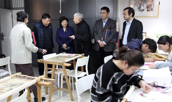 活动结束后,马国强、石品、丁昆、连俊洲等专家一行在魏小杰的陪同下,分别参观了孙蕊工作室和林静工作室。在孙蕊工作室内,多位新生正在孙蕊老师的辅导下认真学习汴绣技术。各位专家在参观完工作室后,对于河南轻工职业学院开设的工作室给予了充分肯定,对河南轻工职业学院在艺术领域所做的努力给予了高度好评。