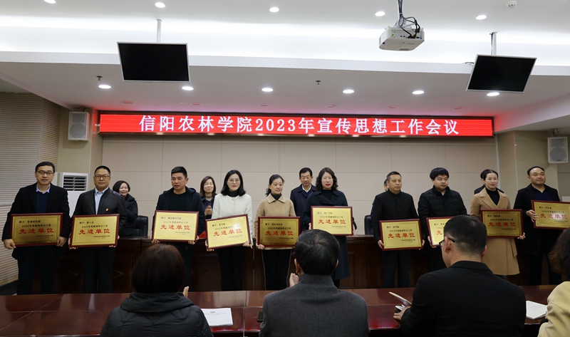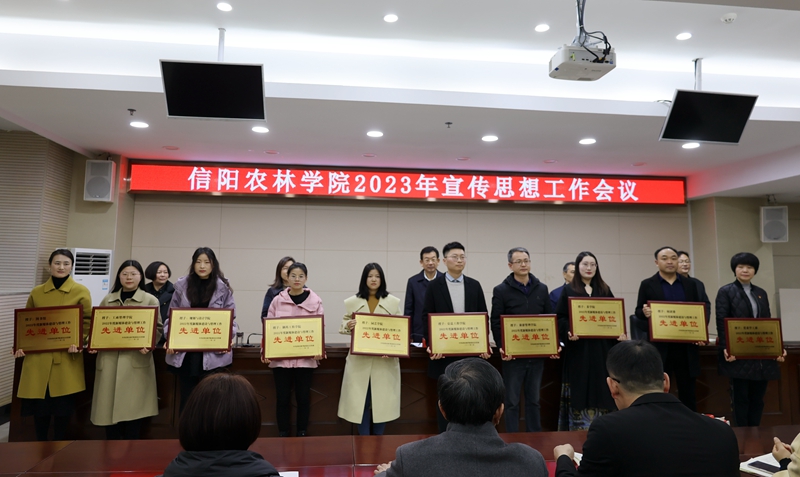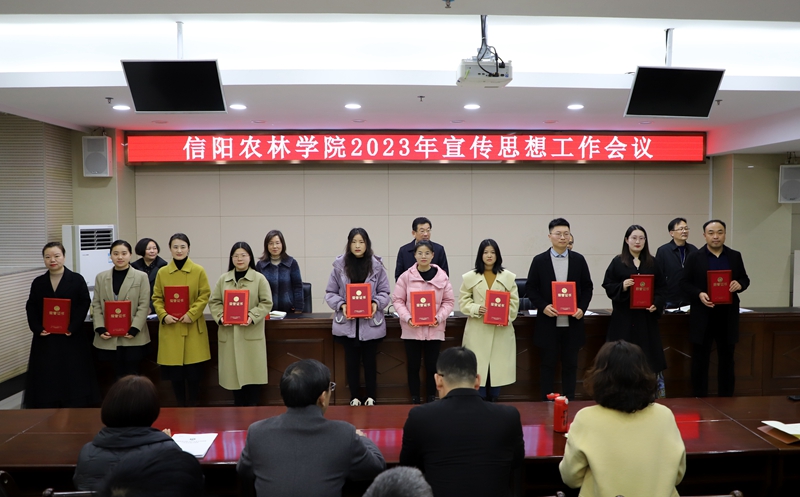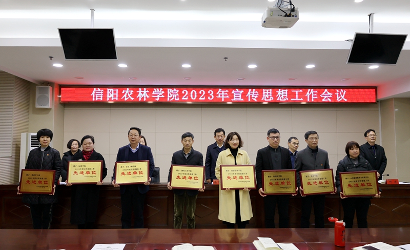 会上,何涛宣读了《关于表彰信阳农林学院2022年度宣传思想工作先进单位的决定》和《关于表彰信阳农林学院2022年度新闻外宣工作先进单位的决定》。张婷宣读了《关于表彰2022年度新媒体建设与管理工作先进单位和先进个人的决定》和《关于表彰信阳农林学院“学习强国”学习平台优秀学习之星的决定》。简频捷回顾总结了2022年学校宣传思想工作情况,安排布置了学校2023年宣传思想工作。