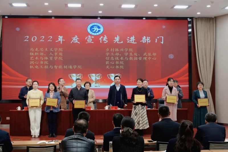 党委书记赵继红高度肯定了2022年全校宣传思想工作暨意识形态工作,并代表校党委向获奖的集体和个人表示祝贺,向大家的辛勤工作表示慰问,向大家为学校事业发展做出的贡献表示感谢。就进一步做好2023年学校宣传思想工作暨意识形态工作,她提出三点要求: 一要提升站位,把握大势,深刻领悟宣传思想工作的使命与担当。要把握国际国内形势,增强宣传思想工作责任感;立足人才需求形势,增强宣传思想工作的使命感;跟上技术变革形势,增强宣传思想工作的紧迫感;聚焦学生心理健康,增强宣传思想工作的实效性展望学校未来发展,增强宣传思想工作的引领力。二要凝心聚力,守正创新,深刻把握宣传思想工作的目标与任务。要高举习近平新时代中国特色社会主义思想旗帜,深入贯彻落实党的二十大精神,自觉承担起“举旗帜、聚民心、育新人、兴文化、展形象”的使命任务,坚持正确政治方向,凝聚学校发展正能量,不断巩固马克思主义在意识形态领域的指导地位,巩固全校师生团结奋斗的共同思想基础。三是务实重干,久久为功,深刻认识宣传思想工作的要求与期望。要旗帜鲜明讲政治,拧紧理论武装“总开关”;要协同发力育新人,构建全员育人“大格局”;要凝心聚力强素质,打造宣传队伍“生力军”;要压实责任守底线,筑牢意识形态“大防线”。