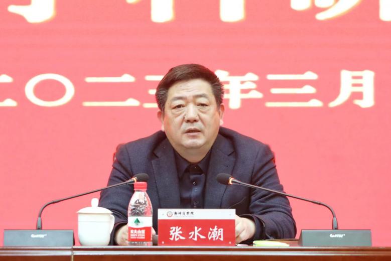 河南省教育厅高教处处长张水潮讲话。张水潮首先代表省教育厅高教处向大会的召开表示祝贺,向学校广大一线教师表示敬意。张水潮表示,来到郑州商学院看到学校取得的发展成绩和丰硕教学科研成果感到很振奋,学校办学定位准确、办学特色鲜明、发展目标清晰,广大教职工保持昂扬向上、奋发有为的精神状态,彰显了全校上下干事创业、潜心育人的浓郁氛围。张水潮指出,当前全省教育系统正在深入学习贯彻党的二十大精神和全国“两会”精神,大力实施创新驱动、科教兴省、人才强省战略,开启现代化河南建设新征程。作为高等教育大省,我们面临着新的机遇和挑战,按照省委省政府关于教育的总体部署,我们必须以前瞻30年的战略眼光、战略思维、战略举措,积极谋划推动高等教育事业发展。