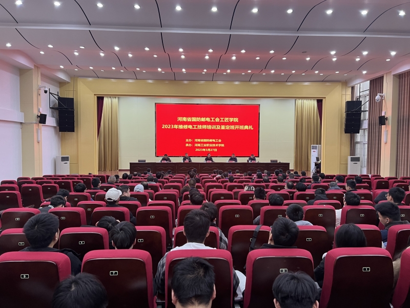 3月27日,河南省国防邮电工会工匠学院2023年维修电工技师培训及鉴定班开班典礼在河南工业职业技术学院孔明路校区学术报告厅举行。河南省国防邮电工会主席杜振卿,副主席李立强,全国劳动模范、全国五一劳动奖章获得者乐凯华光印刷科技有限公司胶印版材事业部设备部经理丁峰,学校党委副书记、工会主席王仁伟,副校长贾庆成出席开班典礼。典礼由贾庆成主持。