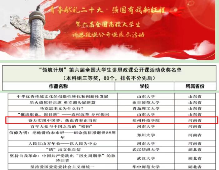 近日,由教育部高校思政课教学指导委员会主办的习近平新时代中国特色社会主义思想大学习领航计划系列主题活动之“青春献礼二十大·强国有我新征程”结果公布,由郑州科技学院马克思主义学院教师刘辉、音乐舞蹈学院教师姚娜、卢璐指导,音乐舞蹈学院学生李旭东、王小慧、狄曼、张华卿主讲的思政课公开课作品《奋进实现中国梦、热血青春正当时》荣获全国本科组三等奖。成为全省本科组获奖院校中的唯一一所民办院校,也是该校首个该类别国家级奖项。