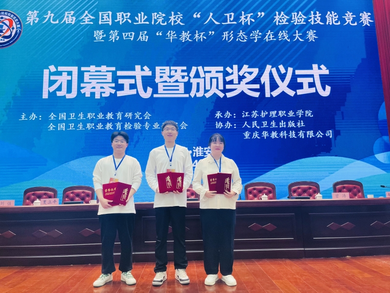 洛阳职业技术学院医学技术学院经过选拔,派出3名学生代表学校赴江苏淮安参赛。比赛前,医学技术学院参赛师生利用课余时间加紧训练,指导教师严格要求,参赛学生刻苦练习。最终在比赛中,参赛学生发挥出色,常靖彬以全国第一名的成绩获得尿常规检验项目一等奖,同时还收获了血常规检验项目一等奖,王硕获得免疫学检验项目二等奖,常靖彬、关玉欣获得形态学检验项目二等奖,学校收获团体三等奖。