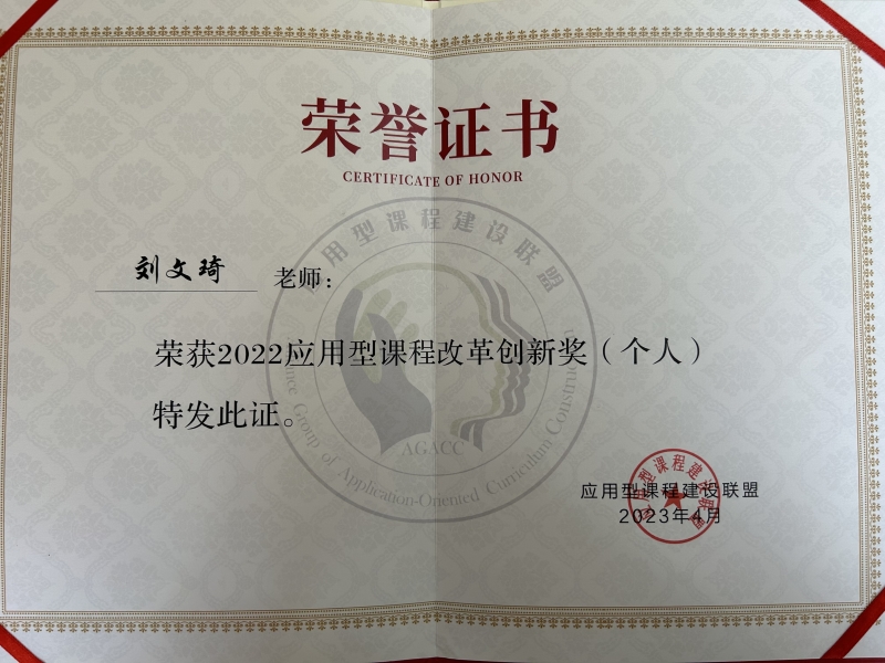 为落实立德树人的根本任务,深化应用型院校课程改革,国家教育部学校规划建设发展中心举办了“应用型课程建设联盟第五届年会论坛”。作为联盟成员学校,黄淮学院文化传媒学院推荐优秀青年教师刘文琦参加联盟课改年度教师奖的评选活动。经联盟专家评审,刘文琦获得“2022年课程改革创新奖”。