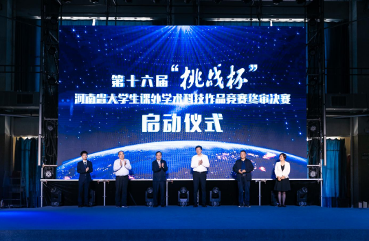 科技创造梦想,挑战成就未来。整场开幕式展现出浓郁的科技元素和滚烫的青春热情。开场节目科技沙画互动秀《科技之路》,以沙为墨,以手为笔,生动的气韵和极强的视觉冲击力“跃然沙上”,创造出一个奇幻的科技视界。诗朗诵《青春告白》,字字饱含深情,句句掷地有声,最后齐呼“请党放心 强国有我”,震撼全场,久久回响。华北水利水电大学杰出校友,著名科幻作家刘慈欣先生为本次“挑战杯”录制专属VCR《时代之声》,他寄语广大青年“激发想象力,一起叩开创造之门”!歌曲联唱《向上的力量》,旋律动听优美,歌词大气磅礴,充分展现了学校学子多才多艺、昂扬向上的青春风采。“5、4、3、2、1”,相关领导一同上台,手触感应掌印,全场师生呐喊计时,只见一条条炫酷的科技电流直冲云霄,汇聚一点,第十六届河南省“挑战杯”大学生课外学术科技作品竞赛终审决赛字样闪现在眼前,定格在屏幕,大赛正式启动。