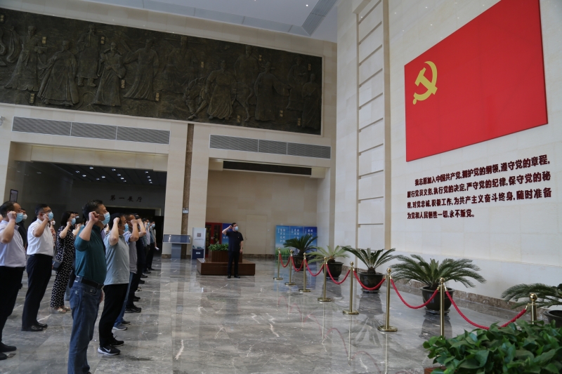 来到教育馆大厅,全体人员站在党旗下,由梅杨领誓,大家庄严宣誓,重温入党誓词。在教育馆讲解员的引领和讲解下,全体党员领导干部依次参观了“中国古代廉政文化展”、“中国共产党党风廉政建设展”、“新时代河南全面从严治党成果展”三个主题展厅。每个展厅紧扣廉政主题,突出文化特色,通过展板、图片、文字资料、全息投影、多媒体播放等多种形式,直观生动地展示了中华民族五千年的廉政思想、制度、人物和故事,展示了中国共产党百年的党风廉政建设光辉历程,展示了近年来我省全面从严治党成果。