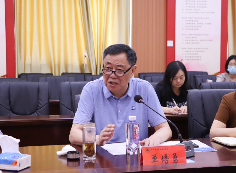 在主题汇报阶段,单培勇以《以民办高职院校为基础 以马克思主义学院成立为起点 为创建省高校示范性马克思主义学院而努力》为题,从马克思主义学院概况与建设指向、打造思政“金课”的主要做法、《习近平新时代中国特色社会主义思想概论》教学概况与主要特点、提高教师素质、存在问题与改进措施等五个方面进行了汇报。