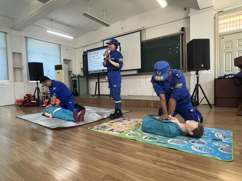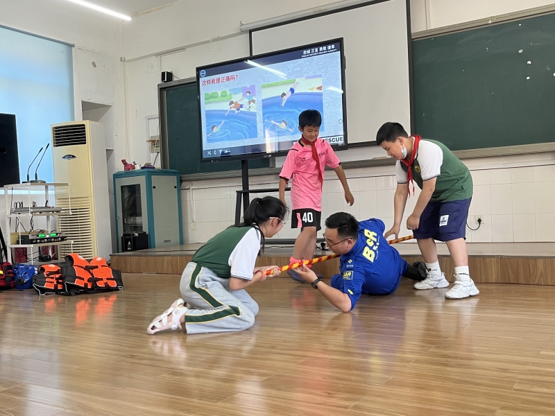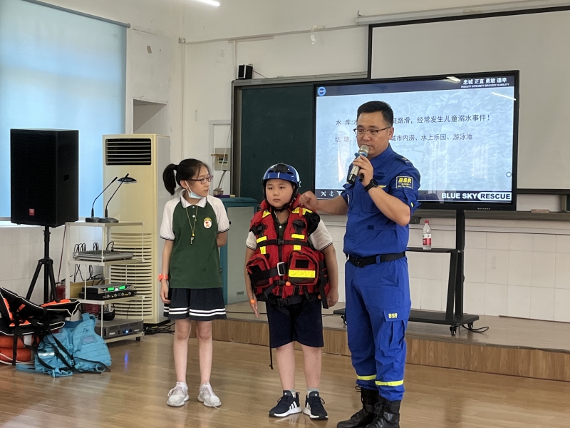 活动中,蓝天救援队志愿者从牢记防溺水措施、如何预防溺水、如何辨别溺水、发现溺水时如何自救、如何科学正确施救他人等方面进行讲解,展示了溺水事故救援现场的图片,用真实的案例和数据讲述了溺水事故的危害,现场演示了救生圈的正确使用方法、救生衣的正确穿着、心肺复苏操作,在轻松愉悦的互动氛围中加深了学生对溺水自防自救知识的了解和掌握。