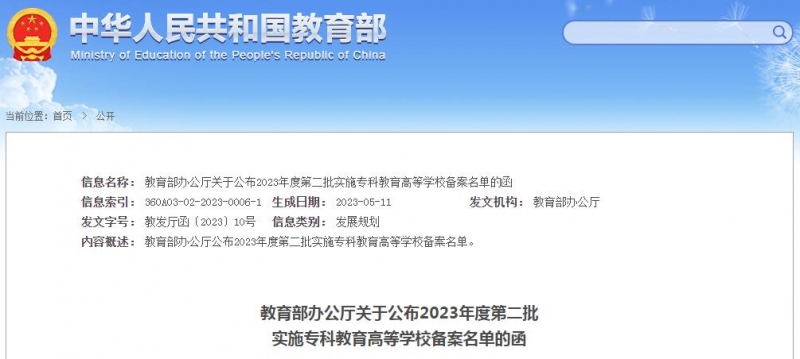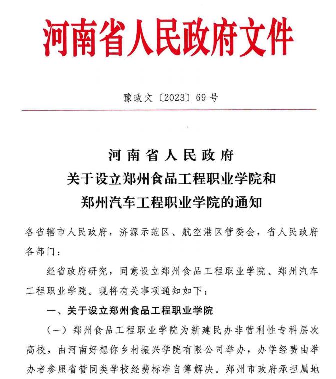 日前,记者获悉,教育部公布实施专科教育高校备案名单(2023年度教育部第二批),河南新增2所学校,其中位于新郑市的郑州食品工程职业学院在列。据了解,今年9月份学院将迎来首批学子3000人。