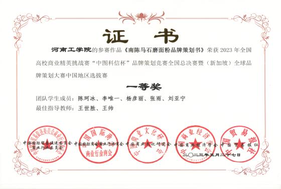 据了解,此项竞赛规模今年再创新高,共有来自全国各地500余所高等院校的3000余支参赛队报名参赛,经过专家评审,有1587支团队入围并参加全国总决赛分组赛环节。经过分组赛环节激烈的角逐,最终评选出了晋级全国总决赛精英赛环节的60支队伍。河南工学院经济学院商务经济学专业学生陈珂冰、李唯一、杨彦丽、张雨、刘亚宁在教师王世胜、王帅的指导下完成的《南陈马石磨面粉品牌策划书》,荣获一等奖并成功晋级精英赛60强。