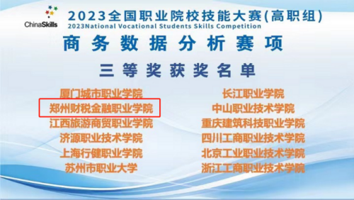 郑州财税金融职业学院会计学院陈艳、胡佳蓥、董燕丰三名学生,在刘伏玲、李伊平两位老师的指导下,经过一天的激烈角逐,取得了国赛三等奖的好成绩。