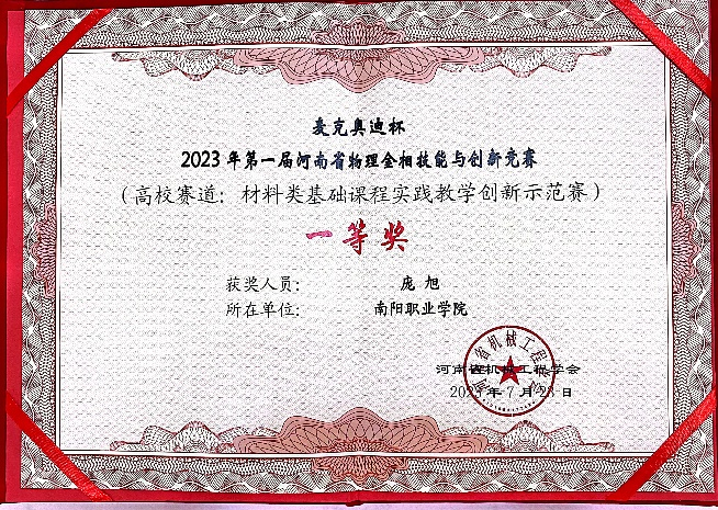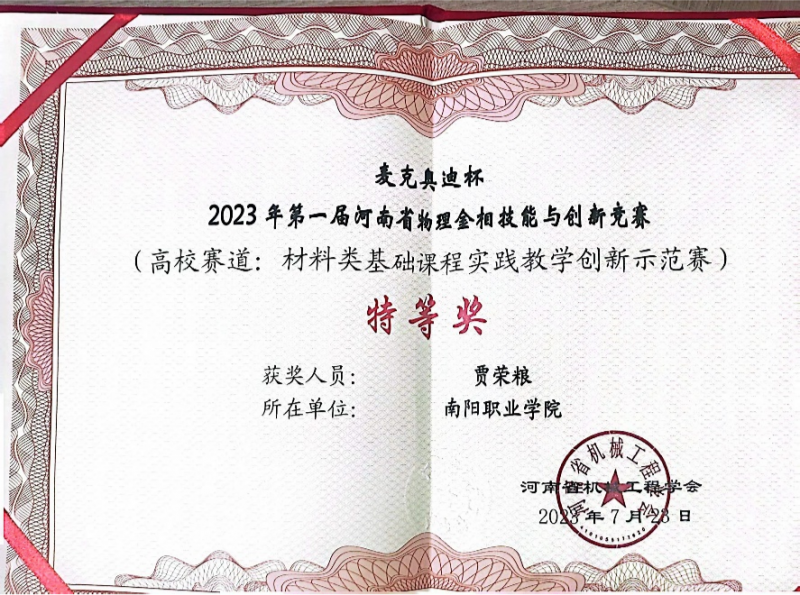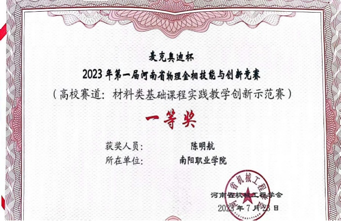 7月21至23日,“麦克奥迪杯”第一届河南省物理金相技能与创新竞赛在郑州轻工业大学成功举办。南阳职业学院教师贾荣粮、陈明航和庞旭代表学校参赛,在高校赛道“材料类基础课程实践教学创新示范赛”中,喜获团体二等奖,并获得个人特等奖一项,个人一等奖两项。