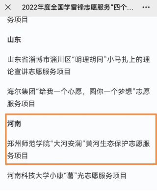 7月30日,中宣部、中央文明办等部门公布2022年度全国学雷锋志愿服务“四个100”先进典型名单,郑州师范学院“大河安澜”志愿服务项目荣获“全国最佳志愿服务项目”,是河南省获得此项荣誉的两个项目之一。