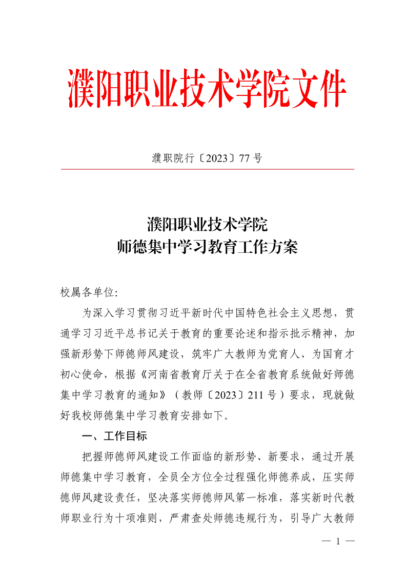 为深入学习贯彻习近平新时代中国特色社会主义思想,贯通学习习近平总书记关于教育的重要论述和指示批示精神,加强新形势下师德师风建设,筑牢广大教师为党育人、为国育才初心使命,教育引导教师进一步规范职业行为、明确师德底线,成为一个有理想信念、有道德情操、有扎实学识、有仁爱之心的“四有”好老师,当好“四个引路人”,根据《河南省教育厅关于在全省教育系统做好师德集中学习教育的通知》(教师〔2023〕211 号)要求,濮阳职业技术学院将师德师风建设工作与暑期教师学习教育工作相整合,开展了一系列学习宣传教育活动,收到了较好的效果。