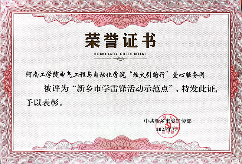 近日,在新乡市2023年学雷锋活动示范点评选活动中,河南工学院电气工程与自动化学院“烛火引路行”爱心服务团被新乡市委宣传部授予“新乡市学雷锋活动示范点”荣誉称号。