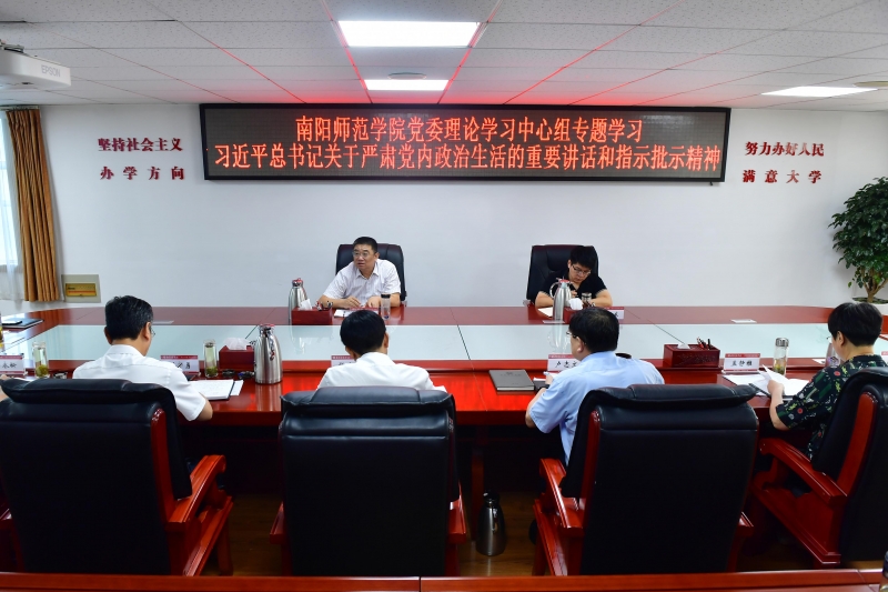 8月19日上午,南阳师范学院党委理论学习中心组在办公大楼三楼会议室专题学习习近平总书记关于严肃党内政治生活的重要讲话和指示批示精神。校党委中心组全体成员参加,省委主题教育第27巡回指导组全程旁听指导。校党委书记卢志文主持会议。
