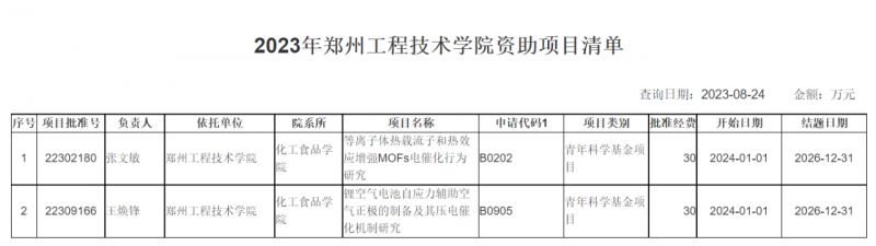 8月24日,国家自然科学基金委员会官网发布了《关于2023年国家自然科学基金集中接收申请项目评审结果的通告》(国科金发计〔2023〕62号),郑州工程技术学院获批2项青年科学基金项目,立项总经费60万元。获批项目分别为化工食品学院张文敏博士主持的“等离子体热载流子和热效应增强MOFs电催化行为研究”和化工食品学院王焕锋博士主持的“锂空气电池自应力辅助空气正极的制备及其压电催化机制研究”。