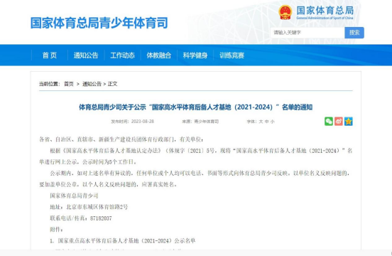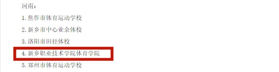 近日,国家体育总局对“国家高水平体育后备人才基地(2021-2024)”名单进行了公示,我校成功入选“国家高水平体育后备人才基地(2021-2024)”,并位列第四名。这是新乡职业技术学院连续第四次入选被评为“国家高水平体育后备人才基地”。