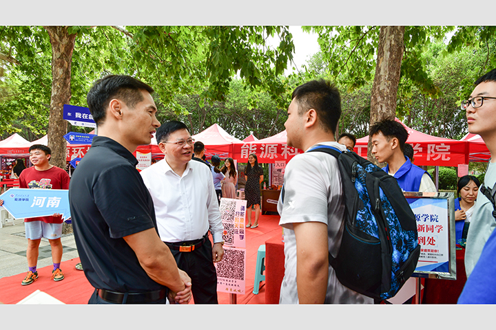 在夏末秋初的理工校园里,114岁的“理”与18岁的“你”撞了个满怀。9月1日至2日,近万名2023级新生从祖国各地来到河南理工大学的校园,开启人生新征程。学校南、北校区处处洋溢着热烈喜庆的氛围,迎新工作井然有序。9月1日上午,新生入学报到高峰期,河南理工大学校领导邹友峰、杨小林、石培哲、翟耀南等一行深入南北校区,检查指导迎新工作,亲切问候新生及家长。
