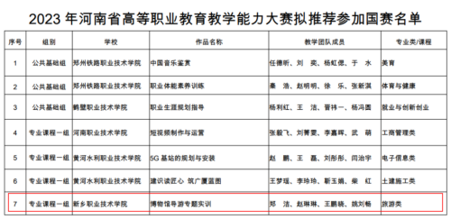 新乡职业技术学院旅游学院旅游教学团队教师郑洁、赵琳琳、王鹏晓、姚刘畅的作品《博物馆导游专题实训》荣获2023年河南省高等职业教育教学能力大赛专业课程一组旅游类一等奖,拟推荐参加国赛。这是学校进入高职赛道以来在教育教学能力赛项中首次入围国赛,实现了质的突破。