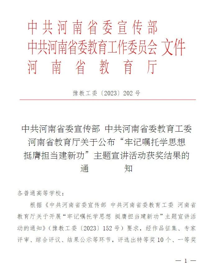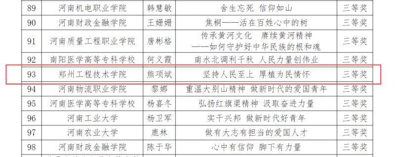 近日,《中共河南省委宣传部 中共河南省委教育工委 河南省教育厅关于公布“牢记嘱托学思想 挺膺担当建新功”主题宣讲活动获奖结果的通知》(豫教工委〔2023〕202号)发布,郑州工程技术学院马克思主义学院熊项斌教授的《坚持人民至上 厚植为民情怀》主题宣讲荣获三等奖。