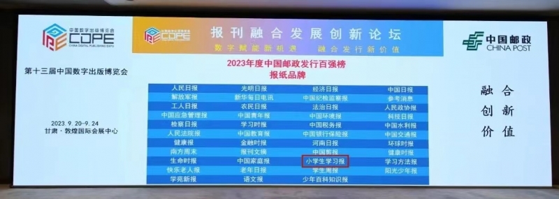 河南教育报刊社主办的《小学生学习报》和《人民日报》《光明日报》《环球时报》《南方周末》《求是》《读者》等报刊一起,入选中国邮政发行百强。在9月20日举办的第十三届中国数字出版博览会上,中国邮政集团有限公司隆重发布“2023年度中国邮政发行百强榜”。