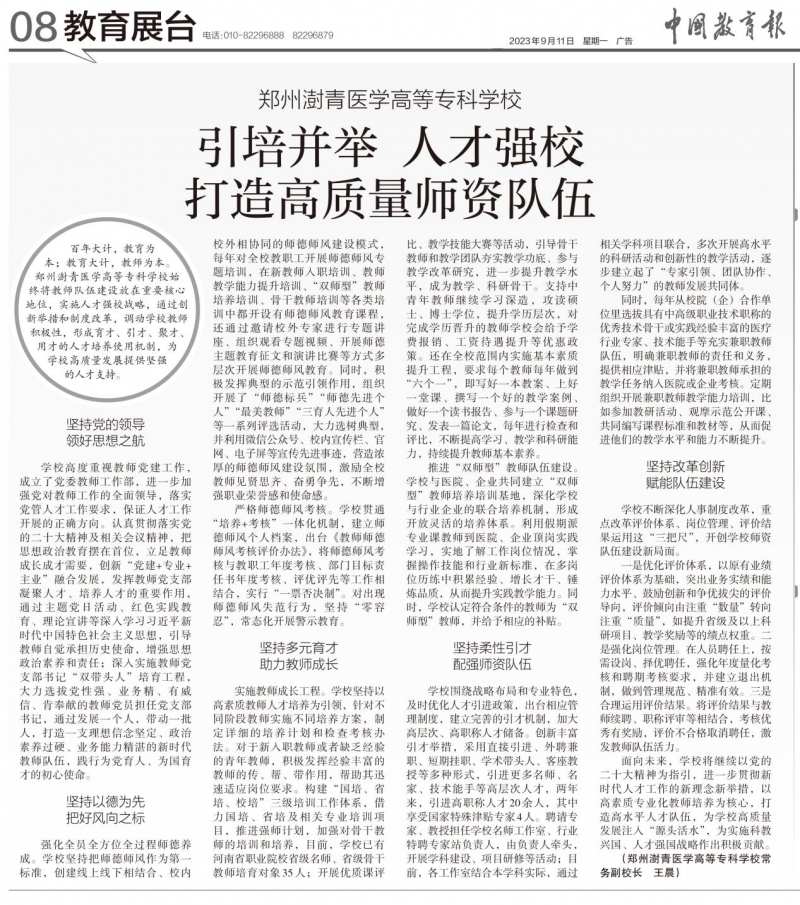 9月11日,《中国教育报》刊发了郑州澍青医学高等专科学校执行董事长、常务副校长王晨的署名文章《引培并举 人才强校 打造高质量师资队伍》。全文如下: