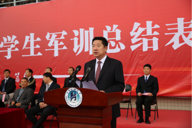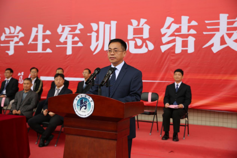 周相寅作军训总结。他强调组织大学生进行军训,是大学生在校期间履行兵役义务、接受国防教育的基本形式,也是为国防和军队培养造就大批高素质后备力量的重要举措,意义重大,使命光荣。多年来,河南工业大学深入学习贯彻习近平强军思想和关于教育的重要论述,坚持把军训作为新生入校的第一课,注重把国防教育渗透到学校日常教育管理全过程,精心策划,严密组织,科学施训,为推进素质教育、通识教育,培养具有科学素养、家国情怀、创新精神和国际视野的高素质人才和行业精英作出了积极贡献,成效显著。希望同学们在接下来的学习生活中,牢记“明德 求是 拓新 笃行”校训,秉承“崇尚科学 勇于探索 报国兴学 自强不息”的工大精神,发扬严谨扎实、坚毅刚强的军训作风,把军训中激发出来的团结、拼搏、进取精神带到今后的学习生活中,成为一流人才,助力强军伟业,在大学这段人生最好的奋斗年华中书写精彩的青春华章,在实现中华民族伟大复兴的接力赛中唱响青春奋斗之歌。