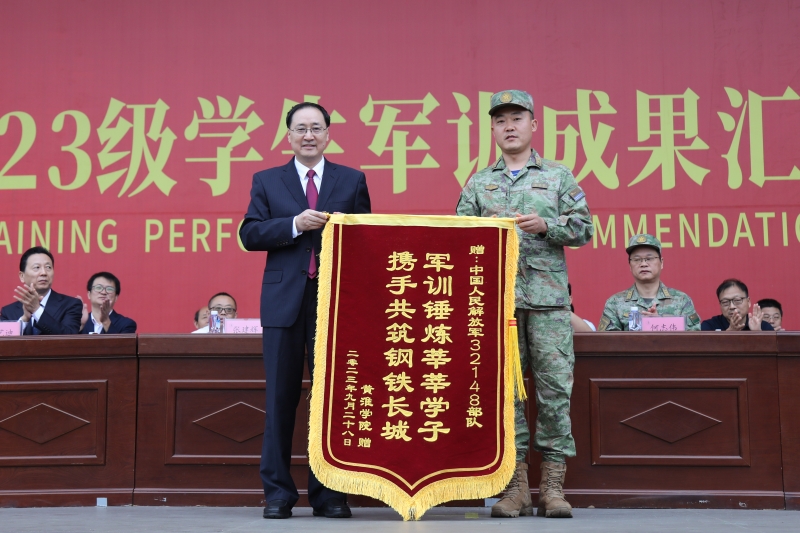 刘彦明向承训部队赠送锦旗,2023级学生军训成果汇报暨总结表彰大会圆满落幕。